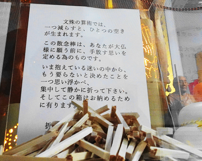 文殊大仏様の前に用意された散念棒は、力を試すためのものではありません。