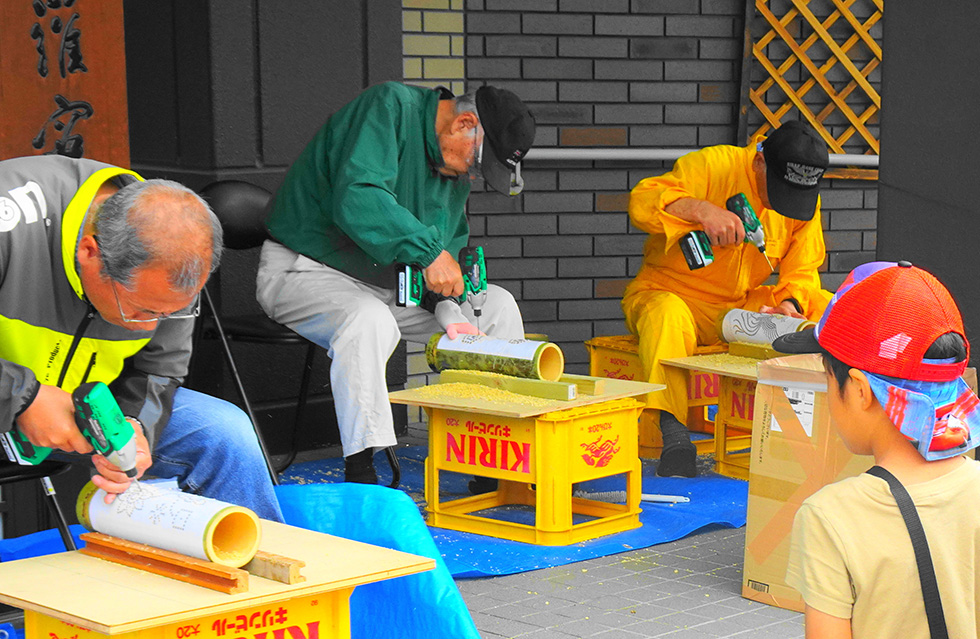 真剣な眼差しで黙々と穴をあけるその傍らから、少年がじっと覗き込んでいます。気づかぬうちに役員さんの額にも汗が光り、竹と向き合う音だけが響いています。