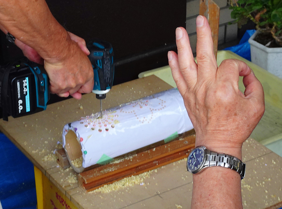 初心者は一人が竹を支え、一人が慎重にドリルを進めています。その先に生まれるのは、祈りを刻むための小さな穴。お二人が協力され息を合わせる姿は、自然と温かな共感の空気が生まれます。