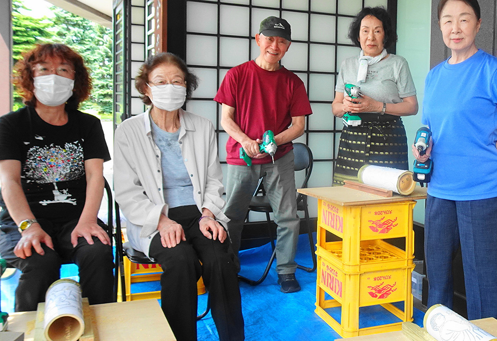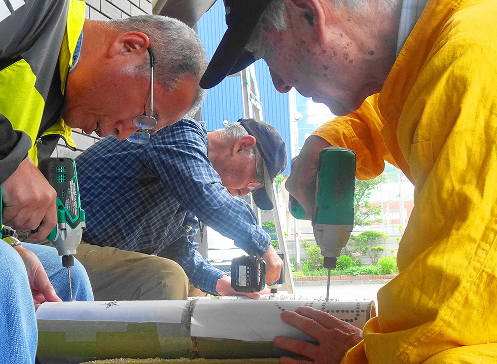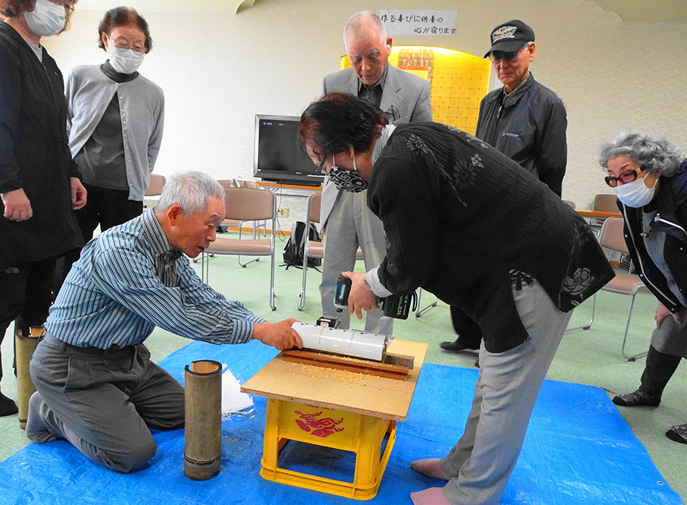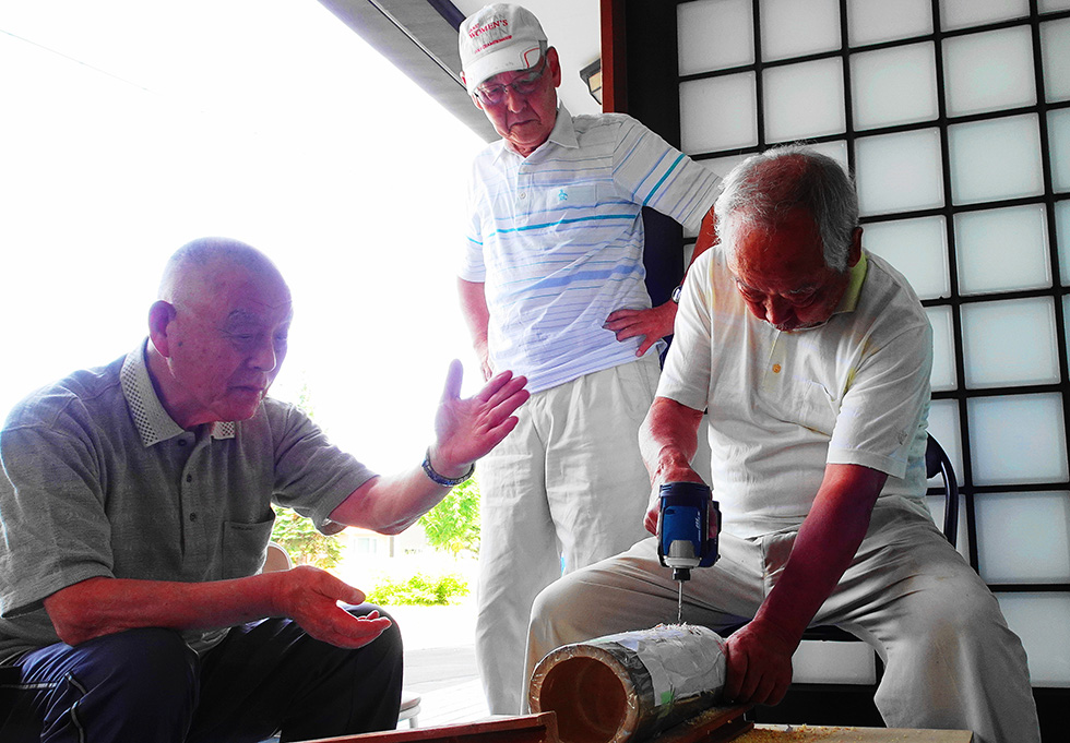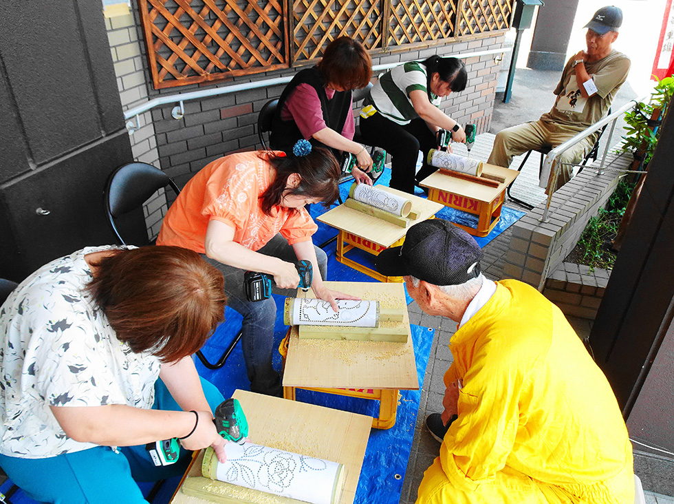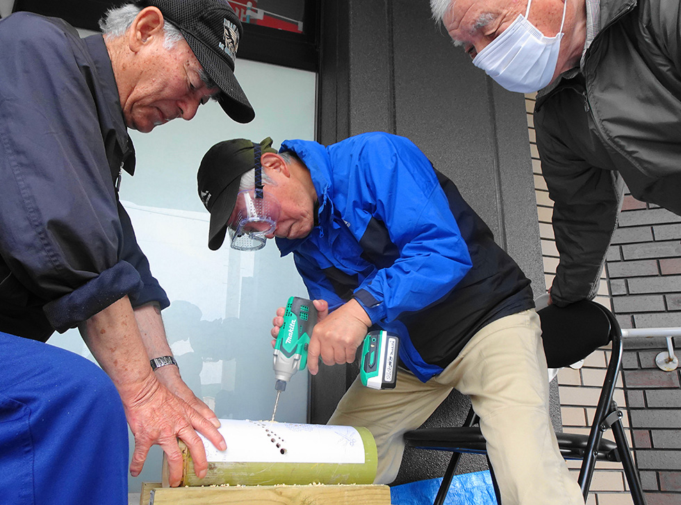 役員の皆さんも竹を手に取り、ひと穴ひと穴を確かめながら作業に加わります。 その手元に込められた想いが形へと。