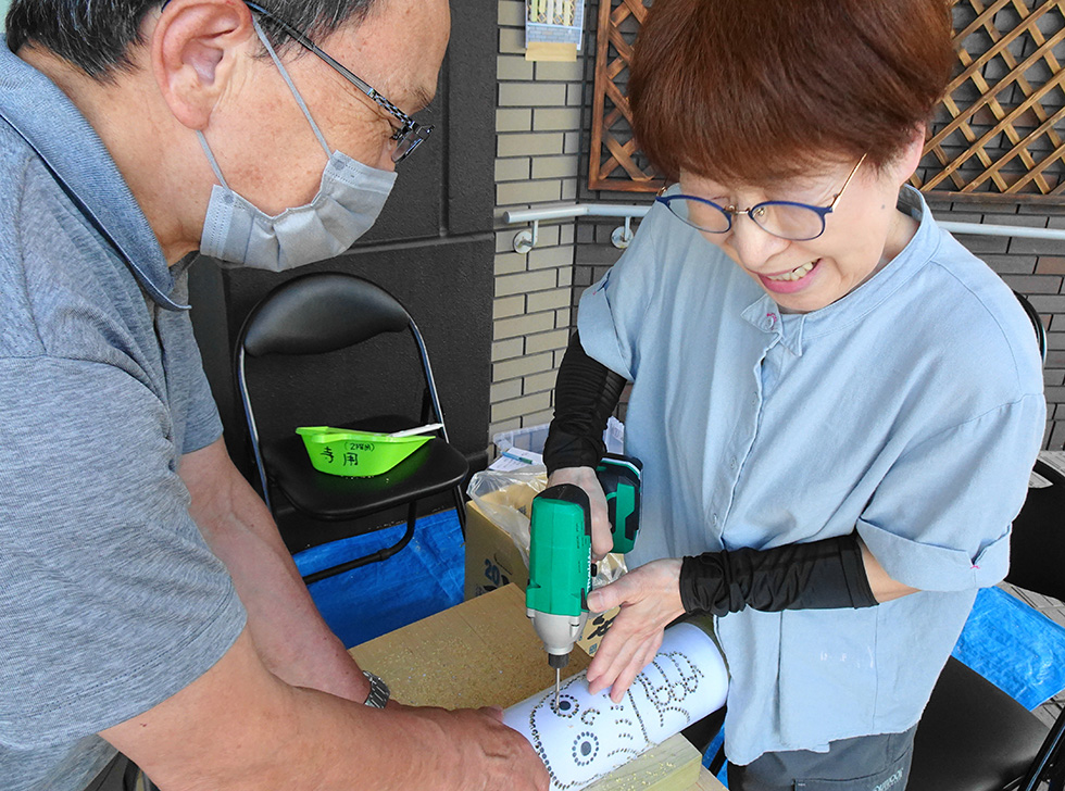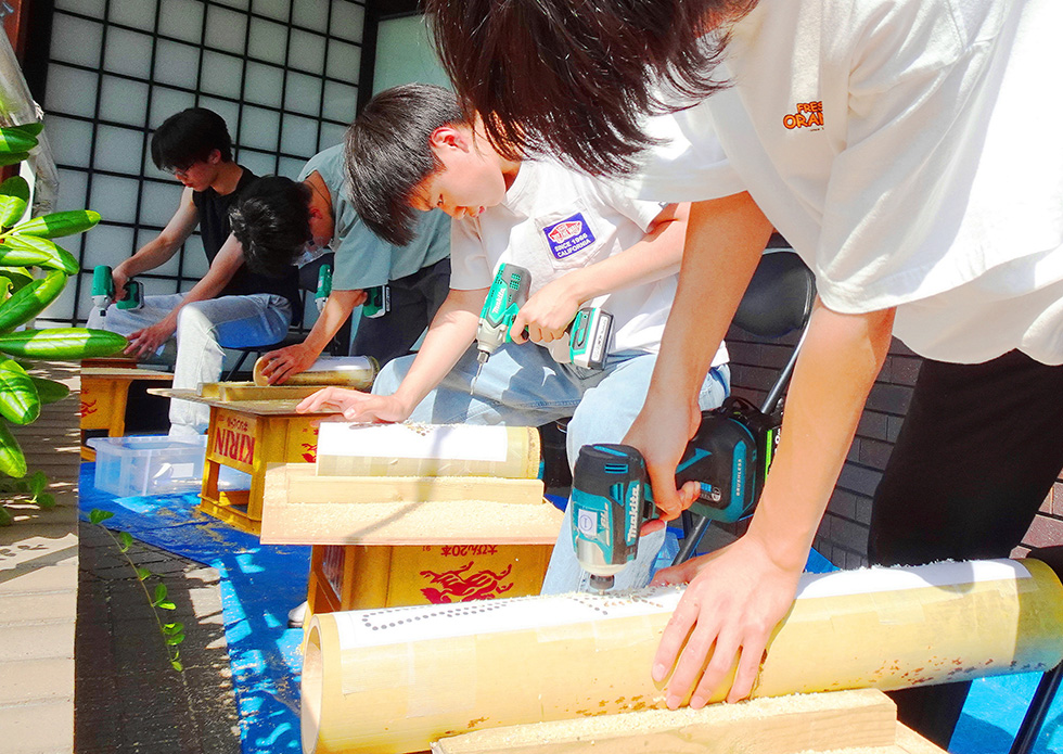 経験の無い竹灯籠作りに。ドリルを手に取り、下絵を確かめながら一つひと竹に向き合い、それぞれの思いが少しずつ宿るかのように。