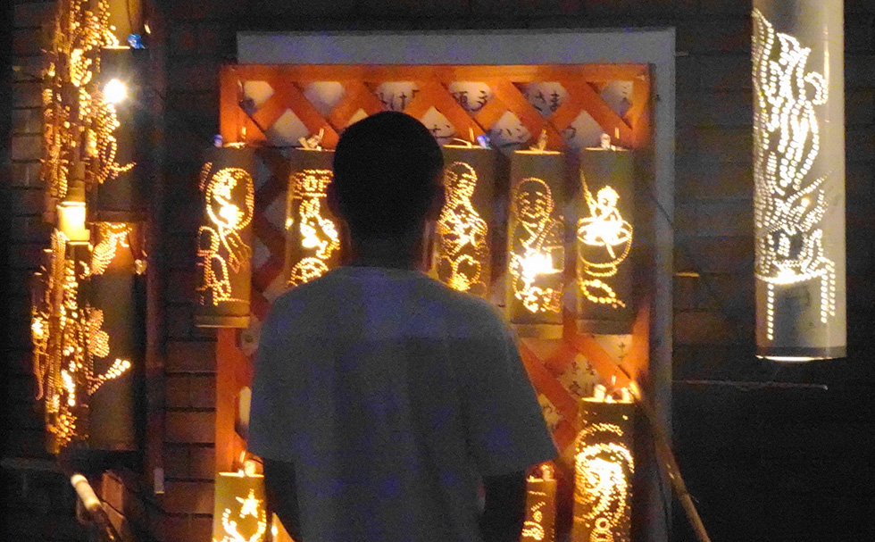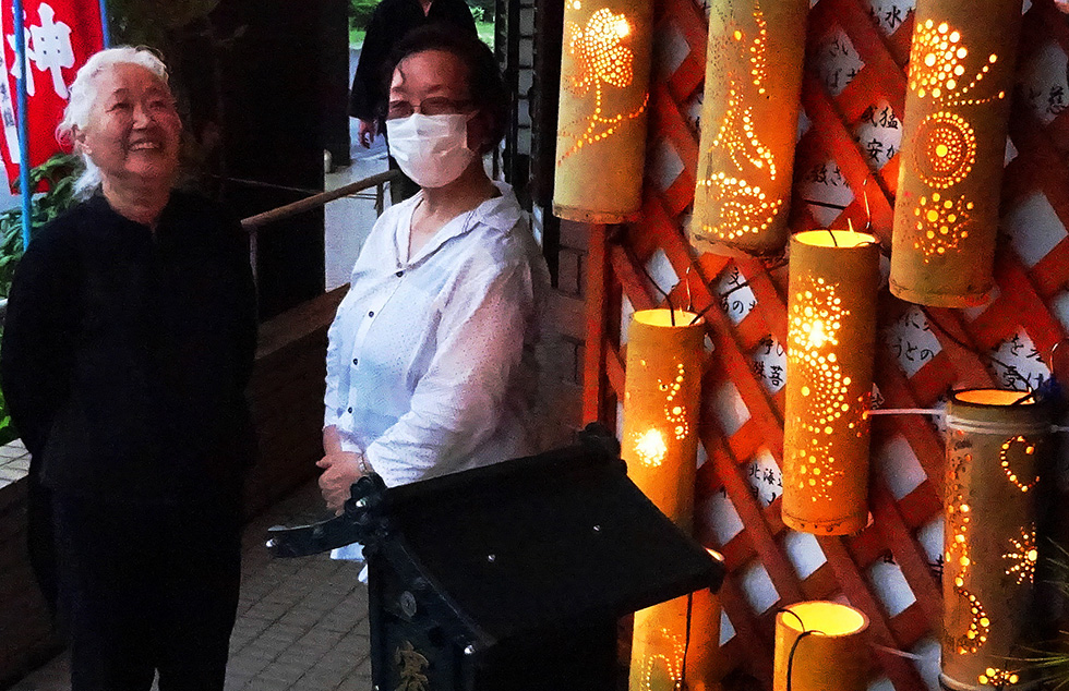 同じころ、竹灯籠にも次々と灯がともり、迎え火の炎と交わりながら祈りの夜が穏やかに開かれていきます。