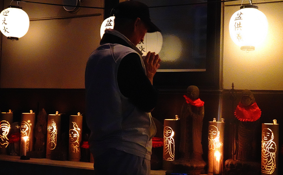 迎え火の灯を自宅へと持ち帰られるお方は、お地蔵様の前でその灯を器へと移し、静かに手を合わせて帰途につかれます。